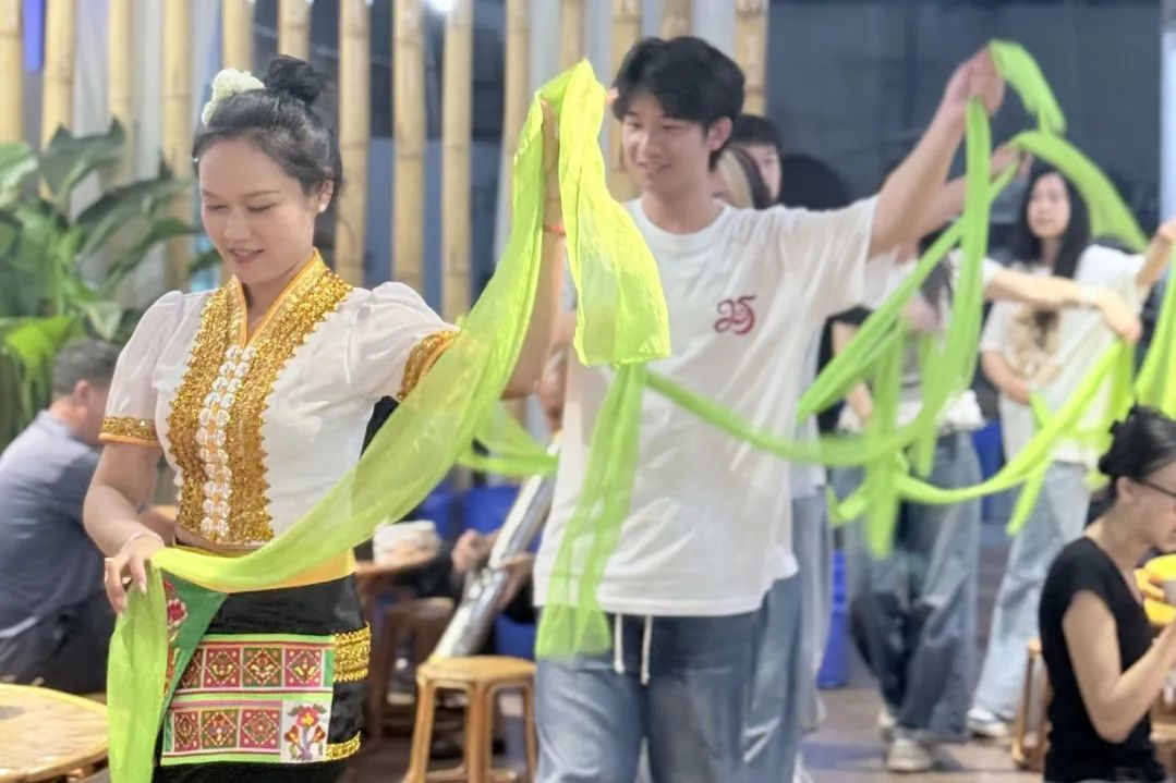 西双楚泰傣味餐厅里,孔雀舞、象脚鼓舞展现着傣族风情。队员们受邀共舞 “三道弯”,团队负责人即兴演绎融合傣族民歌元素的现代歌曲,台上台下的欢声笑语,诠释着 “中华民族一家亲” 的深刻内涵。