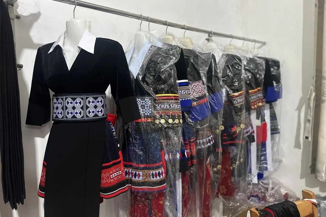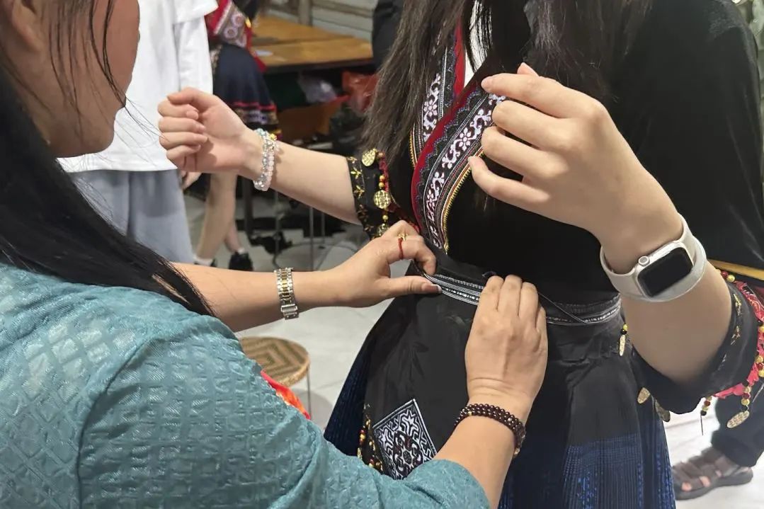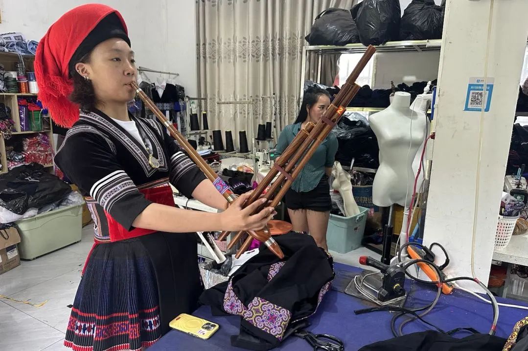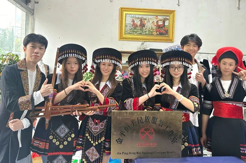 金平县恒美民族服装工作室里,团队成员聆听苗族服饰纹样的吉祥寓意,尝试吹奏芦笙,换上 “花苗”“黑苗” 分支的特色服装。工作室老师通过直播向外界介绍服饰的历史与工艺,成员们参与其中,亲身体验 “指尖上的传承” 如何借助现代传播破圈。