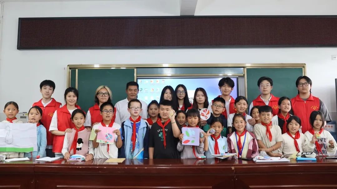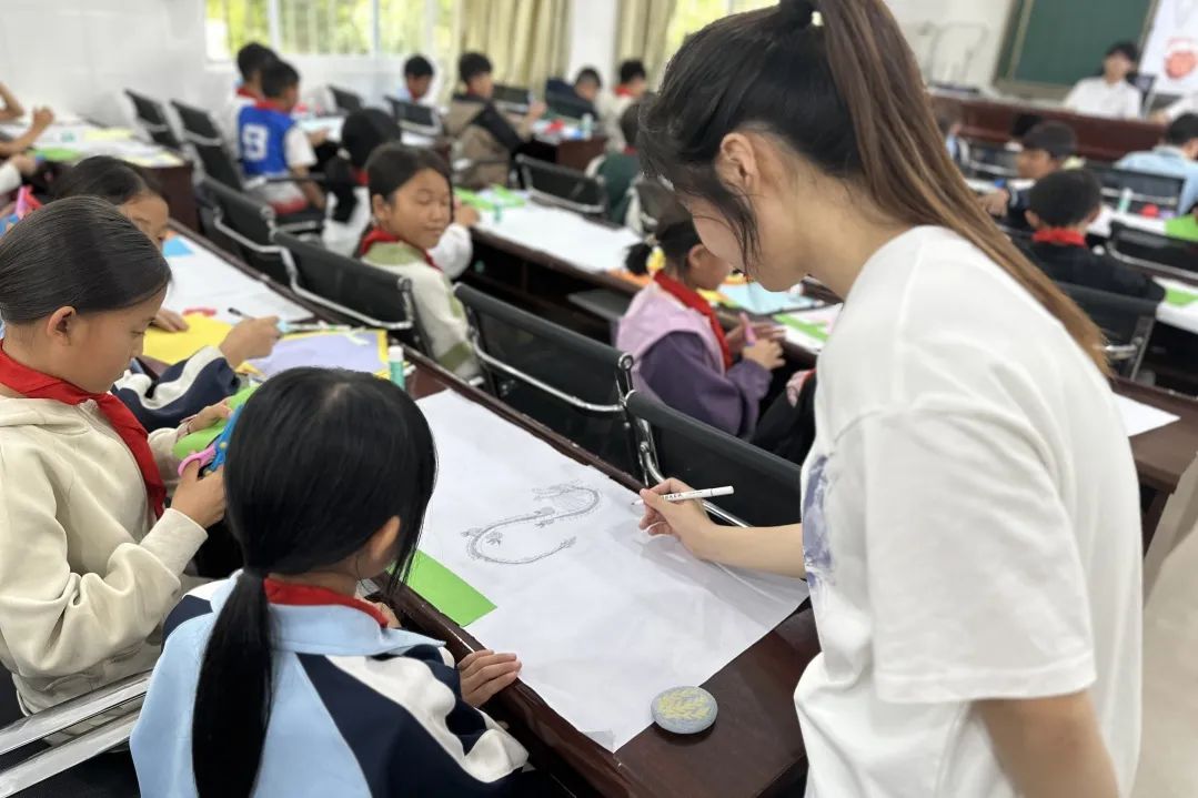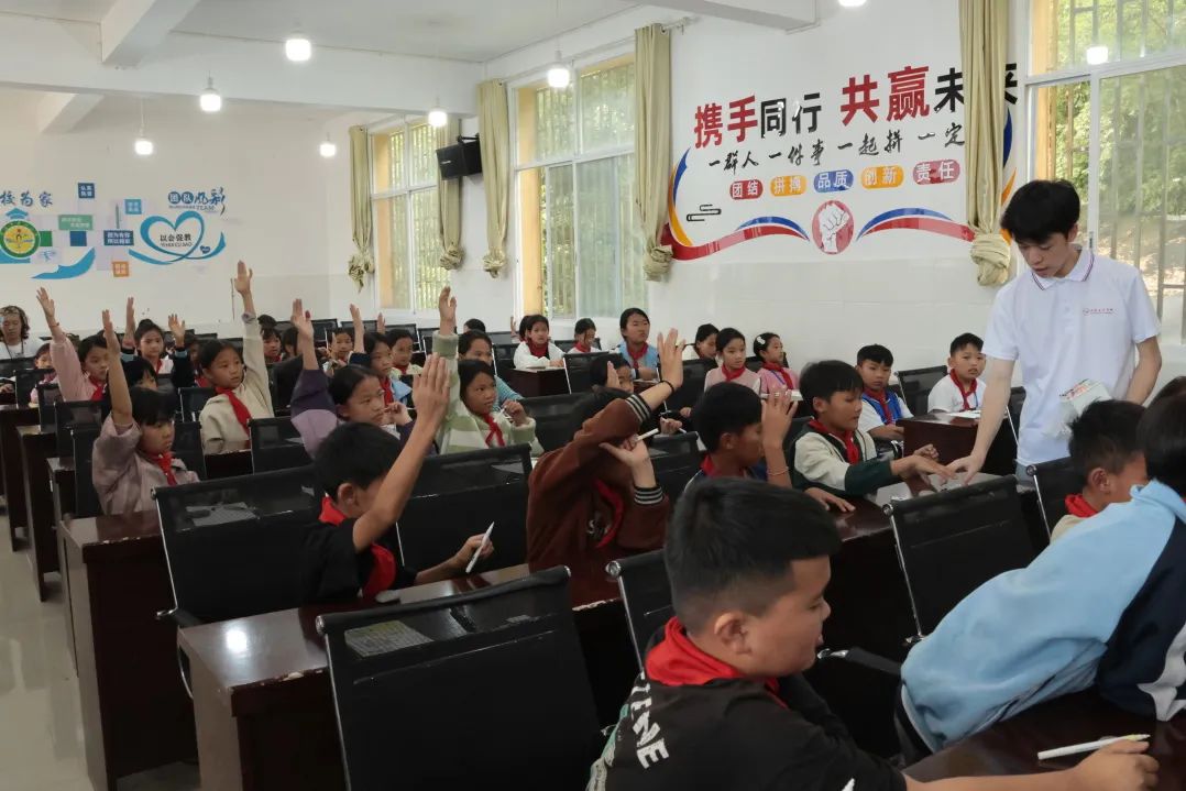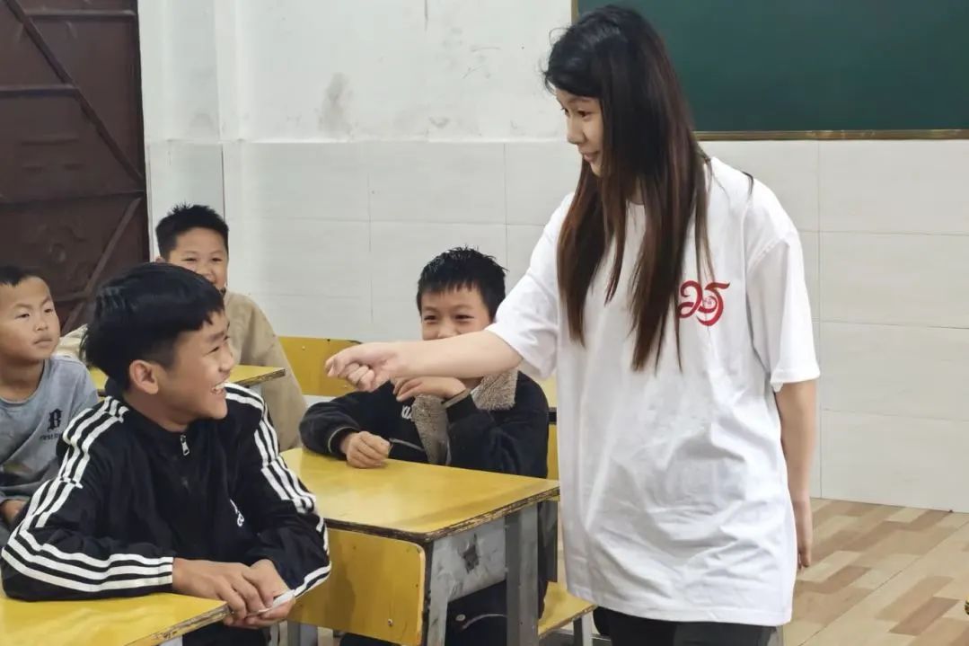 在水碓冲小学的课堂,团队成员带来多元互动:用画笔绘上海风貌,拓宽孩子视野;耐心教题目、玩公益小游戏,传递知识与欢乐;与校长深入交流,共探孩子成长方向,以行动为乡村教育添彩。
