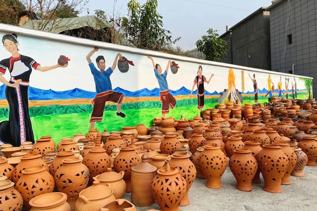 在元阳那里村,“无轮泥条盘筑”“无窑平地堆烧” 的传统技艺令人称奇。水波纹像被风吹皱的澜沧江,螺旋纹藏着傣家人对宇宙的想象,还有简化的孔雀尾羽、菩提叶,这些纹样既是装饰,更是傣族与自然共生的哲学表达。团队成员在州级传承人阮国林的带领下与当地村民共同体验火把节,感受非遗传承与民族文化交融的过程。