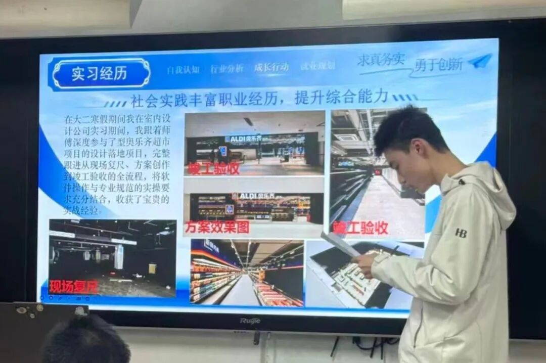他围绕室内设计行业展开职业规划,既分析了行业规模与人才需求,又结合超市设计、全运会转播中心装饰设计的实践经历,明确了短、中、长期目标,聚焦深耕绿色智能设计领域。